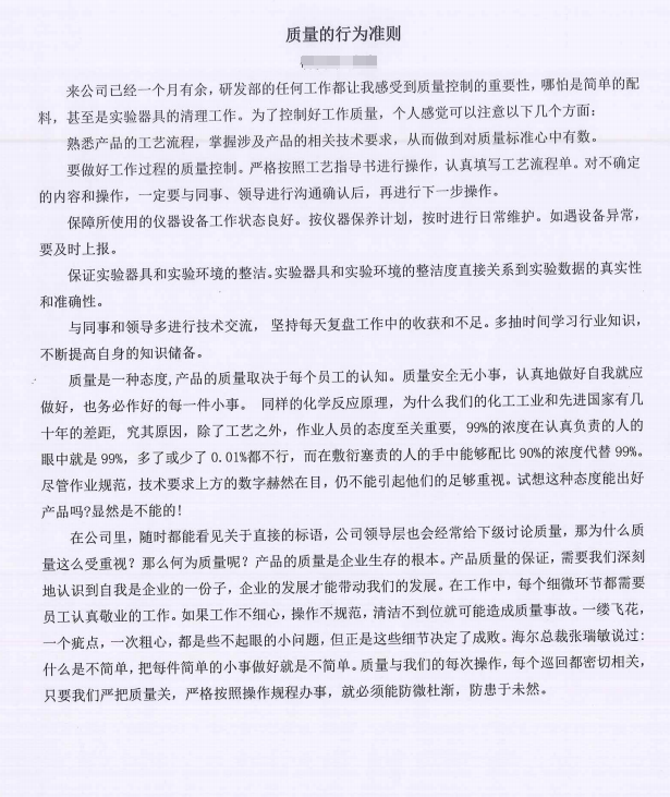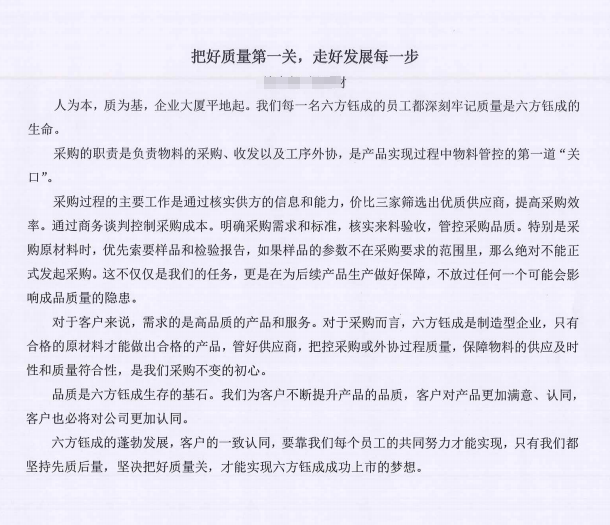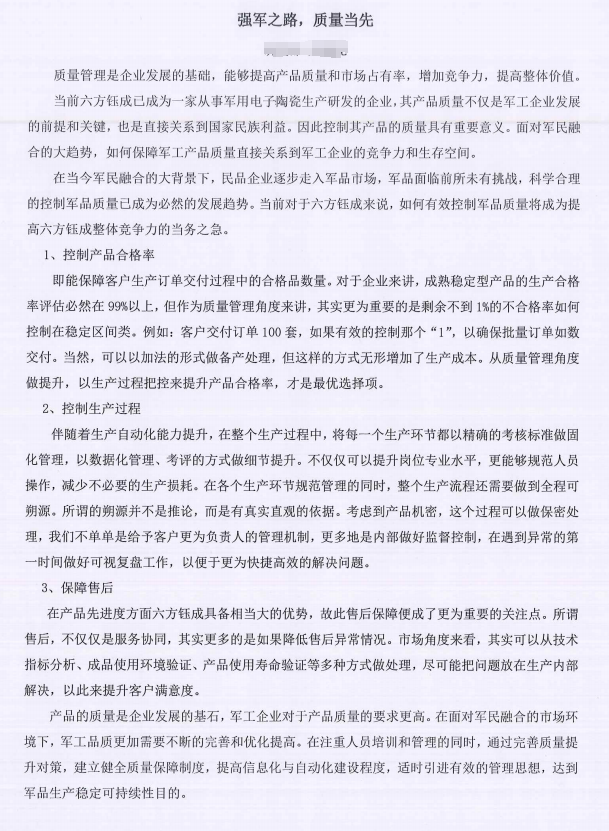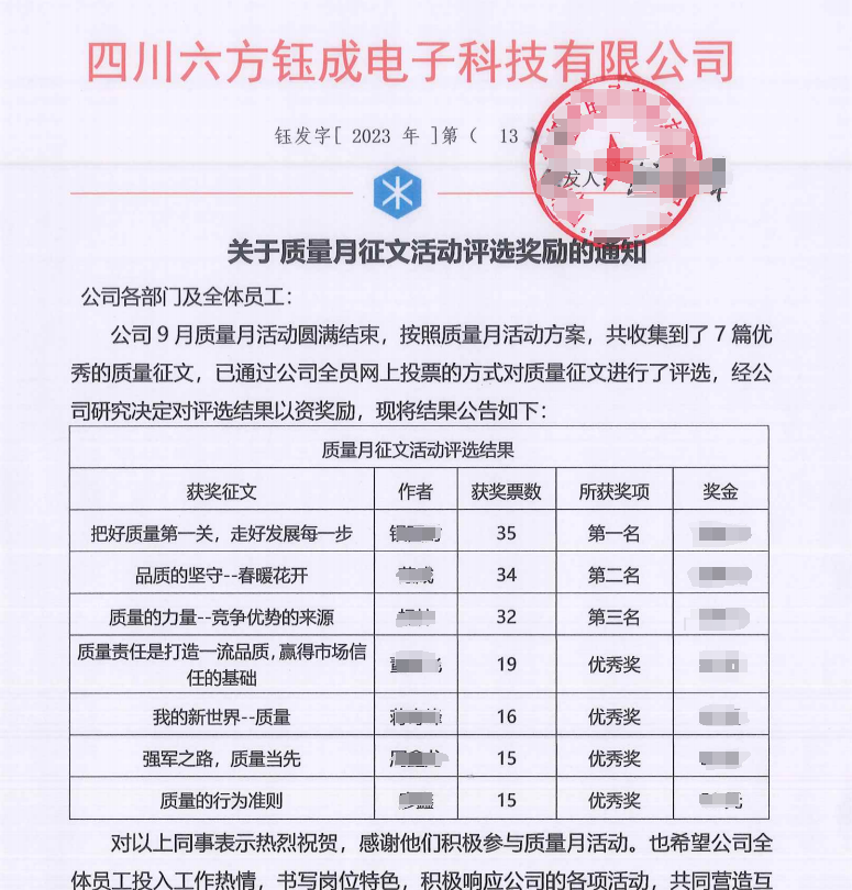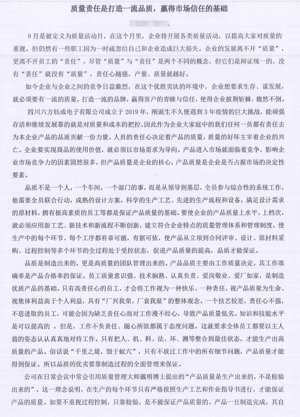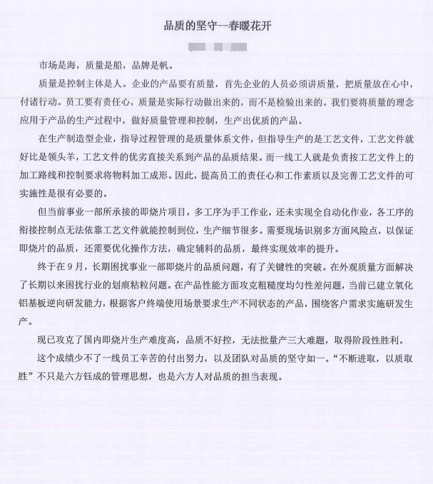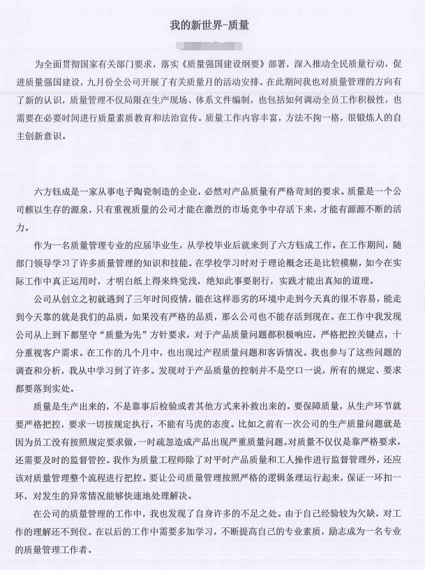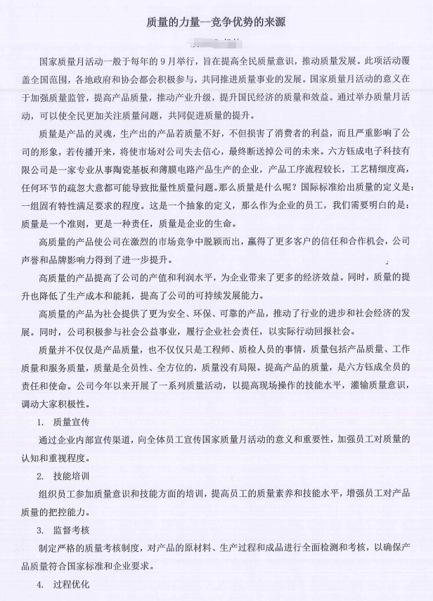 為了動(dòng)員和引導(dǎo)公司全體員工實(shí)施“不斷進(jìn)去,以質(zhì)取勝“的戰(zhàn)略思想,以提高產(chǎn)品競(jìng)爭(zhēng)力為目的,公司“9月質(zhì)量月活動(dòng)”于2023年9月正式在拉開(kāi)帷幕,經(jīng)過(guò)一個(gè)月的質(zhì)量宣傳、培訓(xùn),以及各員工的積極學(xué)習(xí)與配合,質(zhì)量工作取得顯著性成績(jī)。此次質(zhì)量月活動(dòng)公司還開(kāi)展了征文競(jìng)賽活動(dòng),征文內(nèi)容緊扣活動(dòng)主體,文采斐然,涉及到各個(gè)方面的質(zhì)量工作經(jīng)驗(yàn)與方法分享等,經(jīng)過(guò)公司公開(kāi)投票評(píng)選,并對(duì)評(píng)選結(jié)果以資鼓勵(lì),以下為質(zhì)量征文內(nèi)容請(qǐng)大家賞閱:
